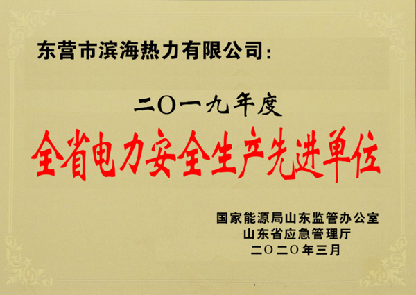 2020年3月2日,國(guó)家能源局山東監(jiān)管辦公室、山東省應(yīng)急管理廳下發(fā)文件,授予東營(yíng)市濱海熱力有限公司“2019年度全省電力安全生產(chǎn)先進(jìn)單位”榮譽(yù)稱號(hào),以表彰公司在全省電力安全生產(chǎn)工作中做出的突出成績(jī)。2019年,濱海熱力公司深入開展電力安全生產(chǎn)專項(xiàng)整治行動(dòng)、電力行業(yè)“安全生產(chǎn)月”活動(dòng),圓滿完成新中國(guó)成立 70周年系列慶?;顒?dòng)電力安全保障任務(wù),為保持全省電力安全生產(chǎn)穩(wěn)定運(yùn)行做出了突出貢獻(xiàn)。