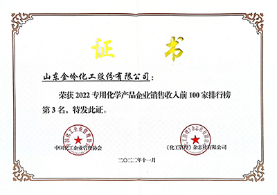 2022年11月29日,由中國(guó)石油和化學(xué)工業(yè)聯(lián)合會(huì)與化工企業(yè)管理協(xié)會(huì)主辦的中國(guó)石油和化工企業(yè)500強(qiáng)發(fā)布會(huì)以網(wǎng)絡(luò)會(huì)議形式召開。在會(huì)上,中國(guó)石化聯(lián)合會(huì)、化工企業(yè)管理協(xié)會(huì)聯(lián)合發(fā)布了“2022中國(guó)石油和化工企業(yè)銷售收入前500家”榜單,金嶺集團(tuán)位列綜合類第49位;金嶺化工股份公司位列獨(dú)立生產(chǎn)經(jīng)營(yíng)類第35位、位列“中國(guó)專用化學(xué)產(chǎn)品企業(yè)銷售收入前100家”第3位。