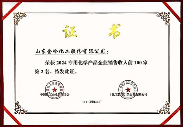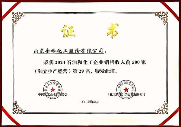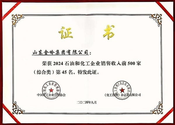 2024年9月12日,中國化工企業(yè)管理協(xié)會(huì)、東營市人民政府在東營市舉辦了“以實(shí)現(xiàn)由大到強(qiáng)的跨越”為主題的2024中國石油和化工企業(yè)銷售收入500強(qiáng)發(fā)布會(huì),發(fā)布了2024中國石油和化工企業(yè)500強(qiáng)榜單,金嶺集團(tuán)位列“2024中國石油和化工企業(yè)銷售收入前500家”(綜合類)第45位;金嶺化工再次入圍“2024專用化學(xué)產(chǎn)品企業(yè)銷售收入前100家,位列第2位;位列“2024石油和化工企業(yè)銷售收入前500家”(獨(dú)立生產(chǎn)經(jīng)營)第29位。