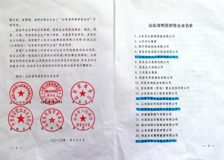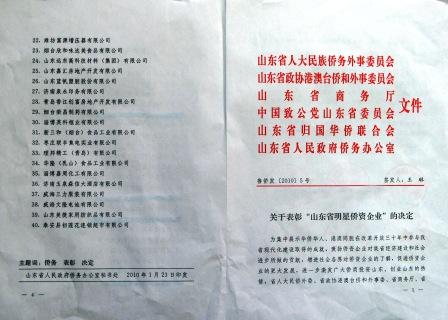 近日,我公司作為僑資企業(yè)被國(guó)務(wù)院僑務(wù)辦公室評(píng)為“全國(guó)百家明星僑資企業(yè)”,被山東省僑辦、省人大民僑外委、省商務(wù)廳、省政協(xié)港澳臺(tái)僑和外事委、省致公黨、省僑聯(lián)評(píng)為“山東省明星僑資企業(yè)”。在40家受表彰的山東省明星僑資企業(yè)中, 我公司排名第5位。